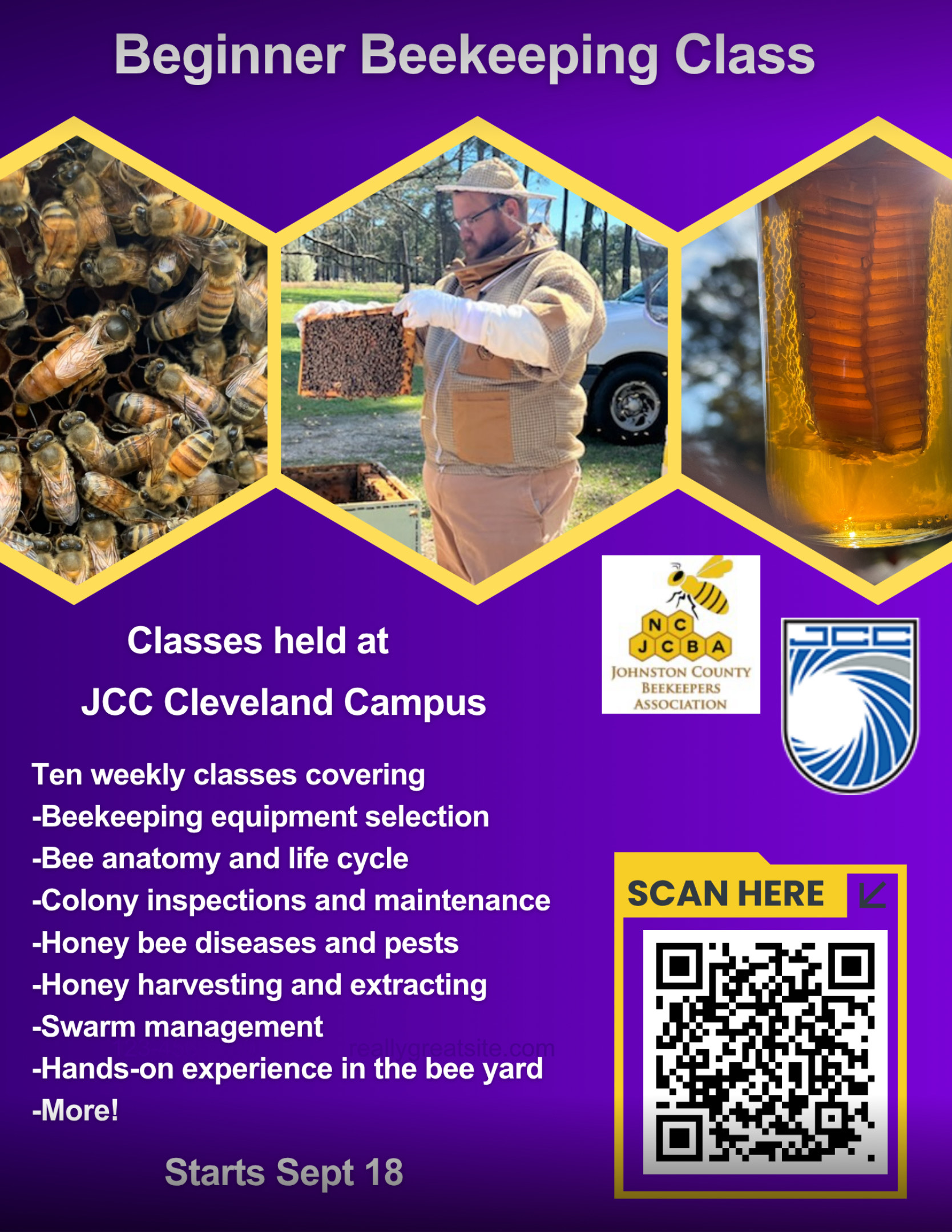 The next Beginner Beekeeper Class at Johnston Community College. Classes held at the Cleveland campus building (near 40/42), while hands-on lessons will take place in the bee yard at the arboretum.
